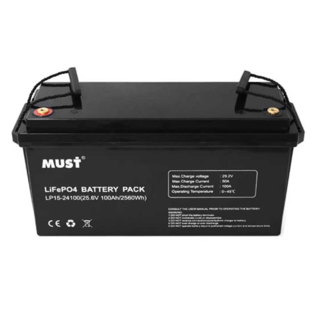 LP15-24100 — це літій-залізо-фосфатна (LiFePO4) акумуляторна батарея на 24В 100 Ач (2560 Вт*год) від компанії Must Power із вбудованою системою керування батареєю (BMS — Battery Management System), яка забезпечує рівномірну зарядку-розрядку АКБ, захист від глибокого розряду і перенапруги комірок, захист від перегріву. У батареї використовуються нові комірки від компанії EVE.